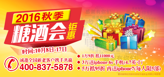 <史上超強(qiáng)>2016秋季糖酒會鉅惠10月8日-17日,1萬抵11000元、3萬送iphone6s手機(jī)、亮黑iPhone7免費(fèi)送、老帶新再獎500元(推薦有獎) 詳情立即致電:4008375878或登陸點(diǎn)擊右邊客服,一對一金牌客服為您解答。手快有、手慢無! |