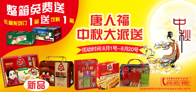 唐人福中秋大派送:無糖禮包系列一箱送一箱編輯:唐人福 發(fā)布時(shí)間:2014-08-02 14:14:56 瀏覽次數(shù):3328人次